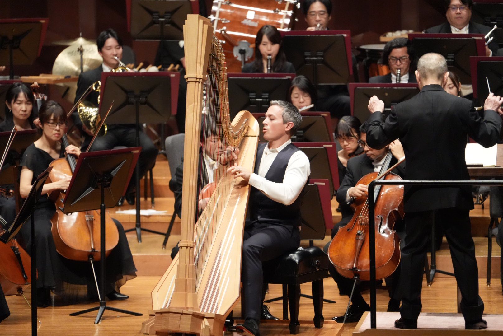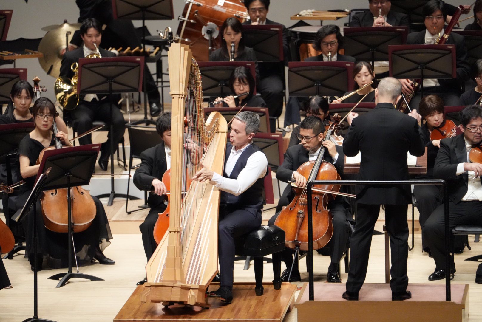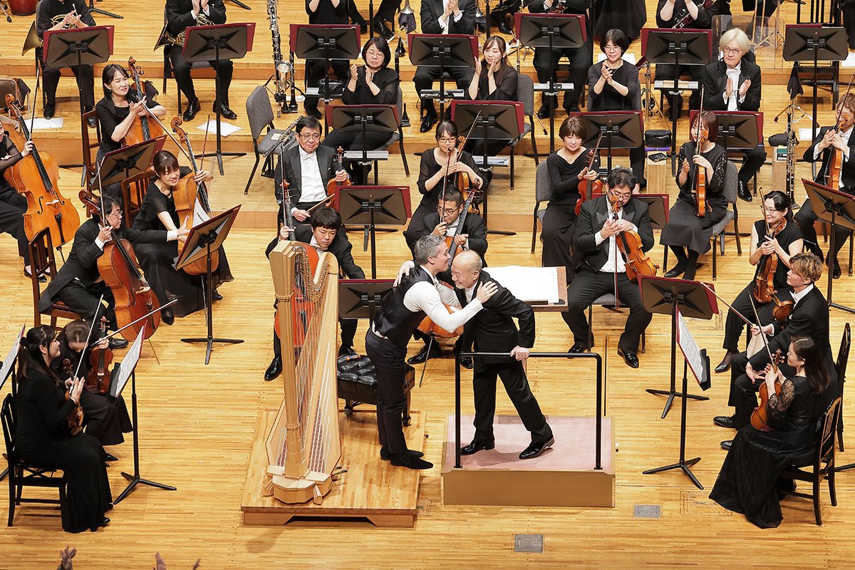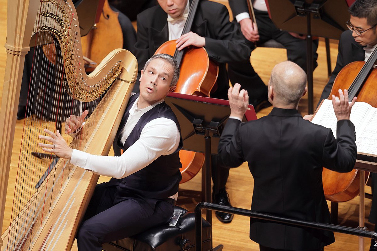 エマニュエル・セイソンさんのハープ力は凄まじいものがあります。ハープの固定概念を吹き飛ばす楽想と演奏スタイルではあるのですが、さらに超えてくる表現力には驚嘆します。激しいけれど力任せじゃない強靭さ。ハープ用にマイク置いてる?!と勘違いしてしまうほどの圧倒的なボリュームと存在感。ハープの響きが引き立つようにと通常のオーケストラよりも少しだけ小さい弦12型編成その必要ないくらいの持って行き感。めまぐるしくキャストが入れ替わり立ち回っても常時輝いてしまう全編主役。ダンスグループなどで一人にフォーカスして追いかけるカメラアングル、韓国語でいうところの「チッケム」状態。英語圏では「ファンカム(Fan Cam)」ですね。もう目も耳も釘付けです。語彙力推し活。