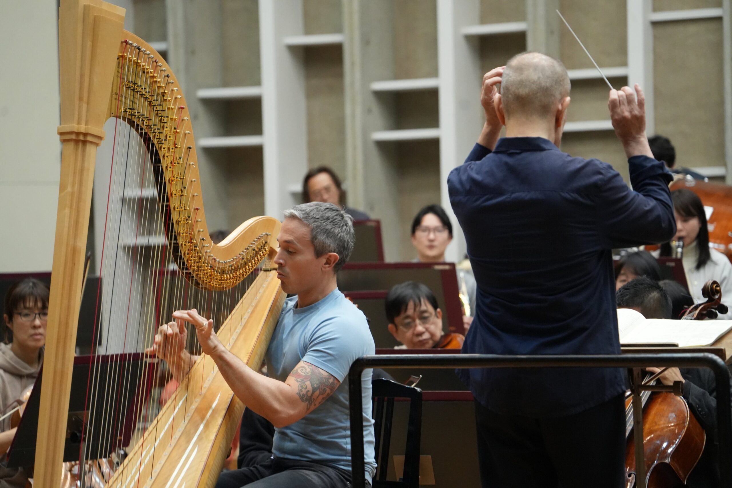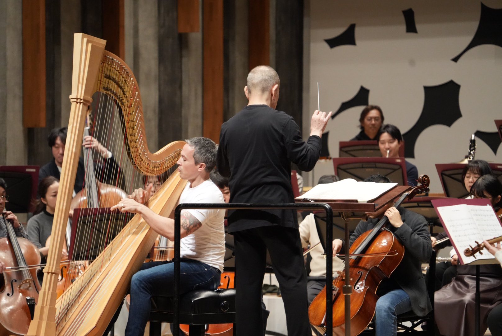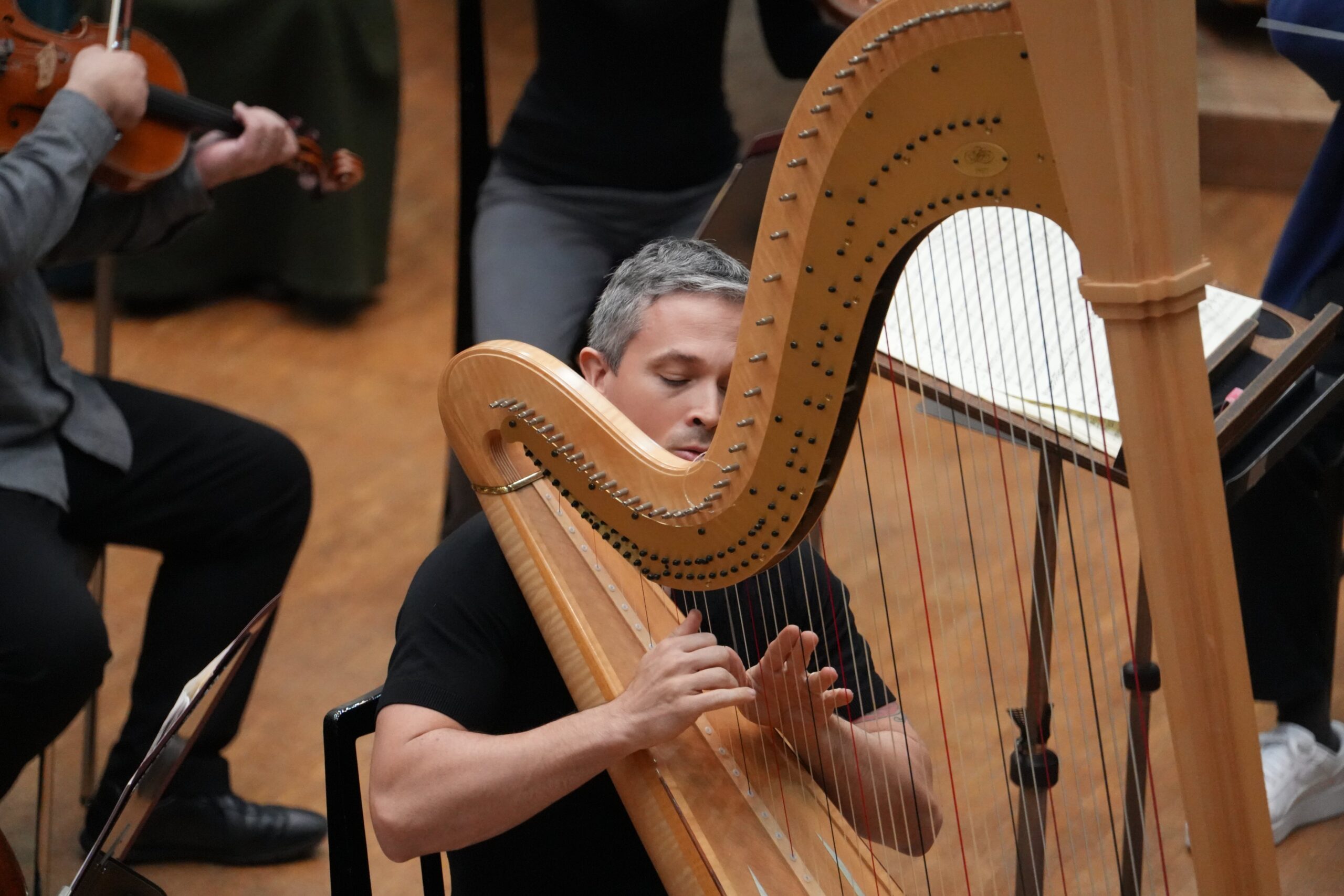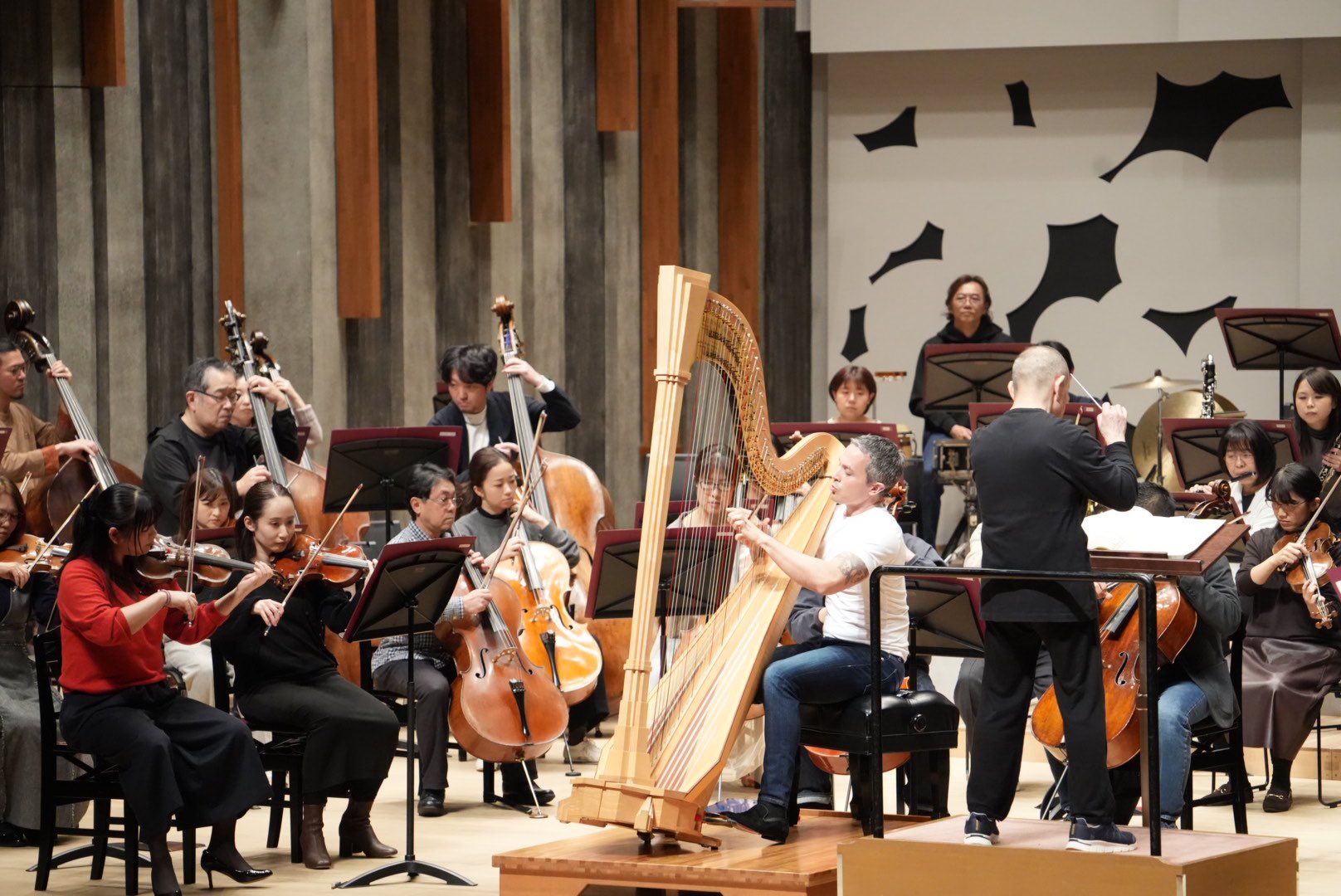 エマニュエル・セイソンさんのハープ力は凄まじいものがあります。ハープの固定概念を吹き飛ばす楽想と演奏スタイルではあるのですが、さらに超えてくる表現力には驚嘆します。激しいけれど力任せじゃない強靭さ。ハープ用にマイク置いてる?!と勘違いしてしまうほどの圧倒的なボリュームと存在感。ハープの響きが引き立つようにと通常のオーケストラよりも少しだけ小さい弦12型編成その必要ないくらいの持って行き感。めまぐるしくキャストが入れ替わり立ち回っても常時輝いてしまう全編主役。ダンスグループなどで一人にフォーカスして追いかけるカメラアングル、韓国語でいうところの「チッケム」状態。英語圏では「ファンカム(Fan Cam)」ですね。もう目も耳も釘付けです。語彙力推し活。